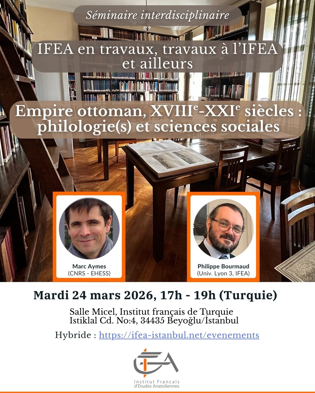 L’idée de ce séminaire interdisciplinaire, ouvert aux chercheurs de tous horizons comme au large public, est de mettre en lumière la richesse des parcours et des travaux menés à l’IFEA et ailleurs dans le champ des études turques. Chaque séance permettra d’approfondir l’histoire de l’IFEA à travers la présentation des trajectoires académiques et culturelles de nos intervenants – enseignants-chercheurs, traducteurs, écrivains ou encore diplomate – tout en ouvrant une réflexion commune sur l’avenir de ces métiers en lien avec les études turques à l’ère des humanités numériques et de l’IA.