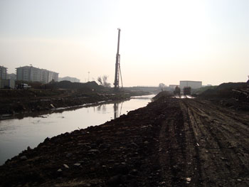 Nous traversons l’Ayamama, contournons les terrains militaires, la station d’épuration inaugurée en 2008, et longeons l’aéroport Atatürk pour nous rendre à un chantier de l’ISKI où nous avons rendez-vous. Une nouvelle autoroute vient d’être ouverte il y a quelques jours pour rejoindre l’aéroport, elle est plus large mais aussi bien plus proche du lit de la rivière que la précédente. A cet endroit-là, sur la rive gauche de l’Ayamama, on voit encore quelques bostan près du cours d’eau : ces potagers qui profitent de la fertilité des berges nous rappelle que jusqu’à la fin des années 1980, le cours de l’Ayamama était encore largement vierge de construction. Le chantier fait partie du projet d’amélioration (ıslah çalışmaları) de l’Ayamama commencé en 2008 par l’İSKİ et l’İBB (İstanbul Büyükşehir Belediyesi, la municipalité du grand Istanbul). Il consiste d’abord à canaliser les eaux usées pour les séparer des eaux de la rivière, les usines dans la vallée de l’Ayamama ayant pour habitude de rejeter leurs eaux usées directement dans le cours de la rivière. L’autre but des travaux est d’aménager l’Ayamama pour rendre le Dünya Ticaret Merkezi (à 900 mètres en amont du chantier) accessible en bateau ou taxi marin (deniz taksi) par la mer de Marmara. Cela implique de rendre la rivière accessible à l’eau de mer et d’installer une écluse, donc d’augmenter l’artificialisation de la rivière. Si ce projet a commencé en 2008, les travaux ont repris plus activement depuis les inondations de septembre. Ils sont planifiés en prévision d’une population de deux millions d’habitants en 2050 sur le bassin-versant de l’Ayamama.