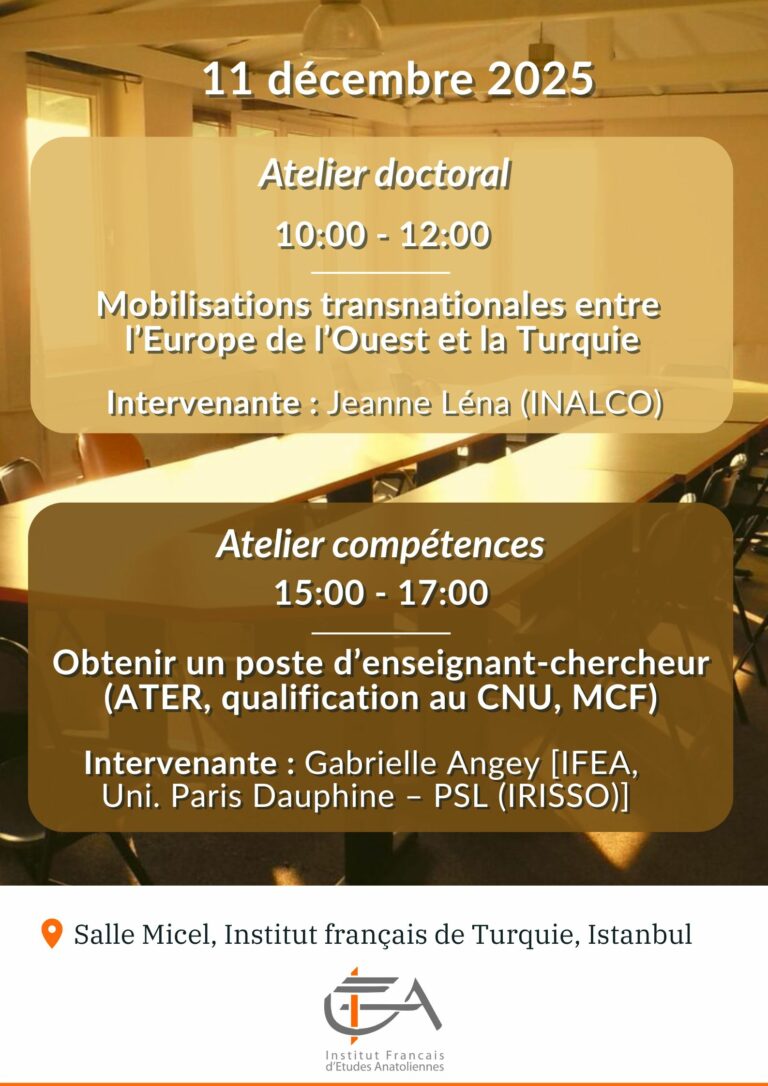 décembre 11, 2025 @ 10:00 – 12:00 – En français En pésentiel Inscription obligatoire avant le 8 décembre à 15h Atelier réservé aux doctorant.e.s boursiers et doctorant.es et jeunes chercheur.es associé.es à l’IFEA Jeanne Léna (INALCO/IFEA) interviendra sur le thème: « Mobilisations transnationales entre l’Europe de l’Ouest et la Turquie ».
