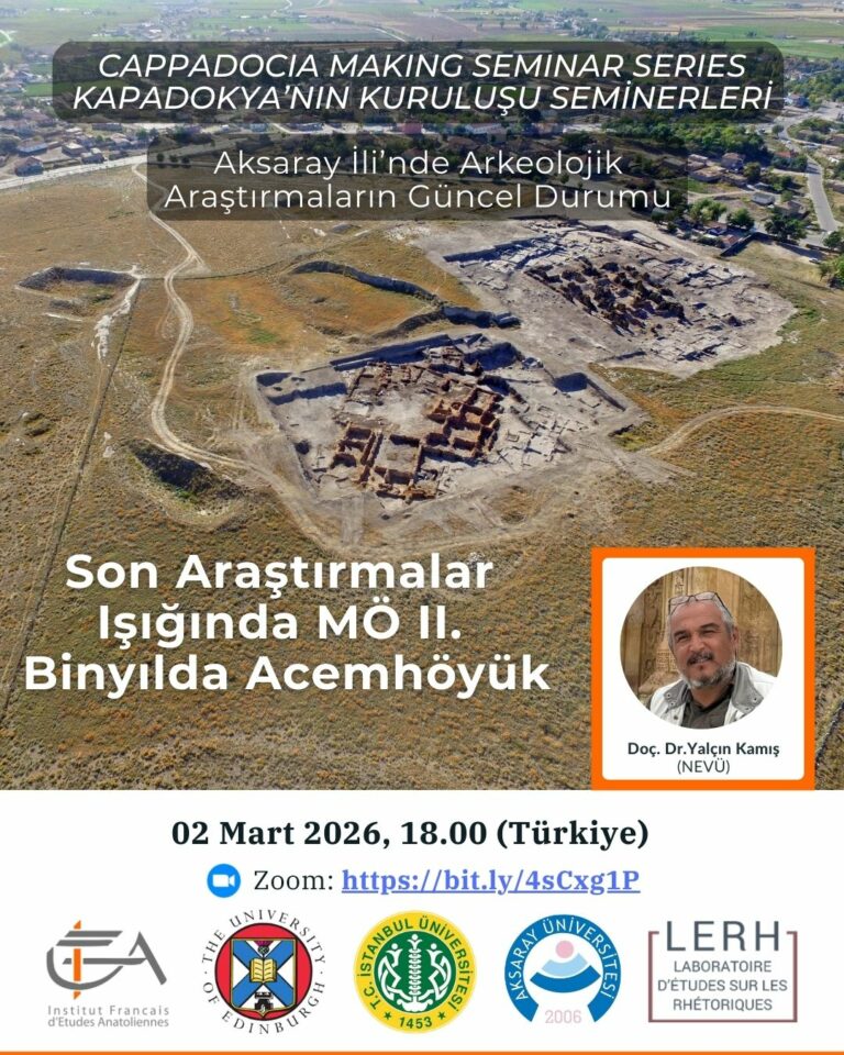 mars 2, 2026 @ 18:00 – 20:00 – Türkçe Online Kayıt ID: 974 8206 9220 Şifre: 494146 Doç. Dr. Yalçın Kamiş (NEVÜ) – Son Araştırmalar Işığında MÖ II. Binyılda Acemhöyük Cappadocia Making seminerleri bu yarıyılda yeniden başlamaktadır. Bu dönemin teması “Aksaray İli’nde Arkeolojik Araştırmaların Güncel Durumu” olacaktır. Seminerler bu yıl Anaïs Lamesa (Edinburgh Üniversitesi / IFEA), Metin Kaya (İstanbul Üniversitesi), F. Işıl Demirtaş […]