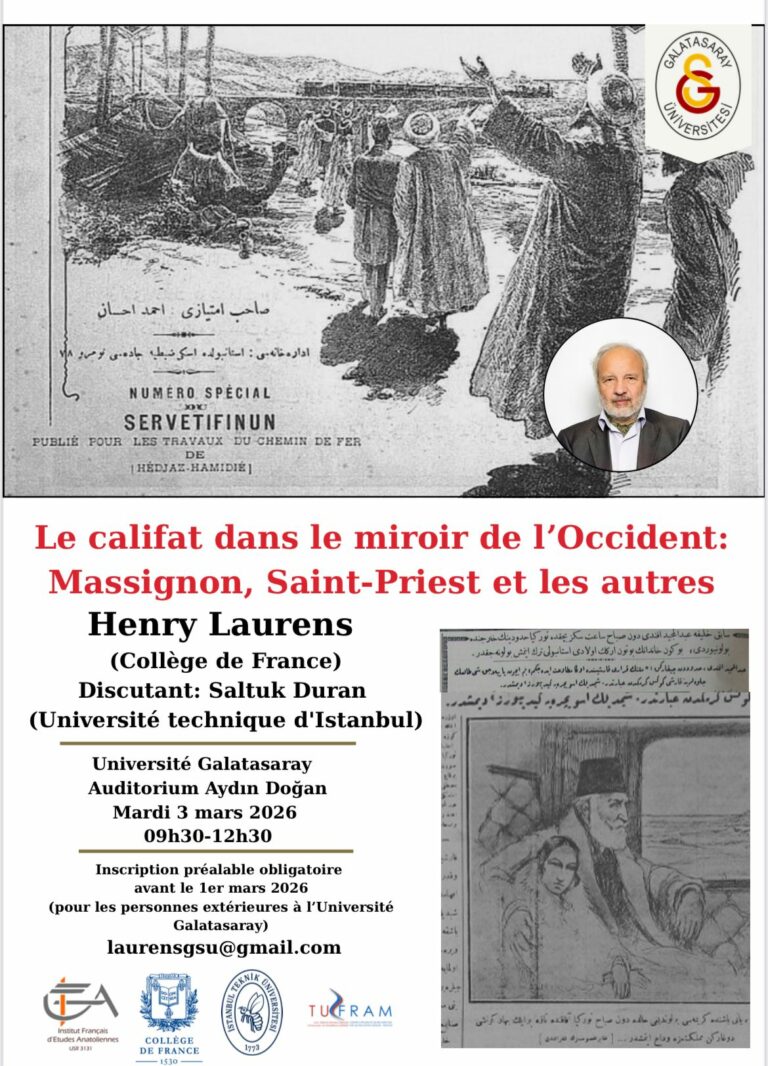mars 3, 2026 @ 09:30 – 12:30 – Date et heure : 03/03/2026 – 9h30-12h30 Lieu : Université Galatasaray – Auditorium Aydın Doğan Intervenant : Henry Laurens Professeur au Collège de France – Chaire Histoire contemporaine du monde arabe Discutant : Saltuk Duran (Université technique d’Istanbul) Sujet : Le califat dans le miroir de l’Occident : Massignon, Saint-Priest et les autres Langue : français […]