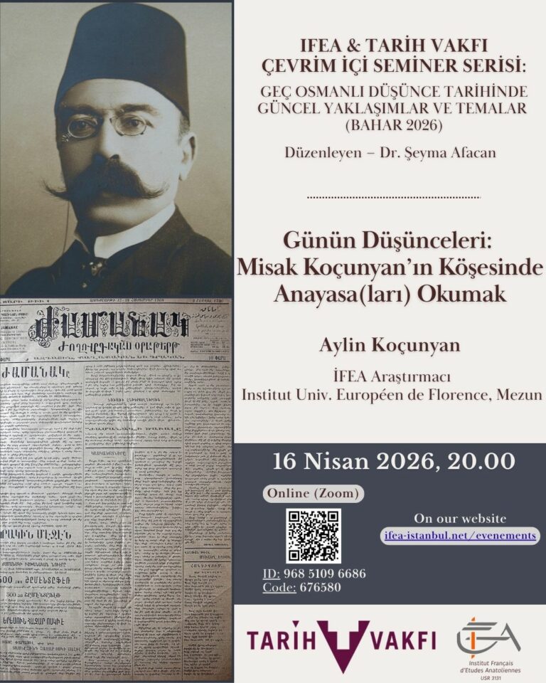 avril 16, 2026 @ 20:00 – 22:00 – 26/03/2026 – 20:00 Türkçe Online ID: 968 5109 6686 Şifre : 216183 Düzenleyen – Dr. Şeyma Afacan (Kırklareli Üniversitesi / İFEA) Aylin Koçunyan (İFEA Araştırmacı, Institut Universitaire Européen de Florence, Mezun): « Günün Düşünceleri: Misak Koçunyan’ın Köşesinde Anayasa(ları) Okumak » Bu seminer serisi, IFEA sponsorluğunda, Tarih Vakfı Yurt Yayınları tarafından 2026 içinde yayımlanması planlanan Geç Osmanlı Düşünce Tarihinde Güncel […]