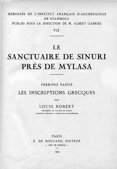 No. 7 Louis Robert, Le sanctuaire de Sinuri près de Mylasa. Première partie. Les inscriptions grecques, 1945, 119 p. + 15 p. pl. (cote COLL I M 07)